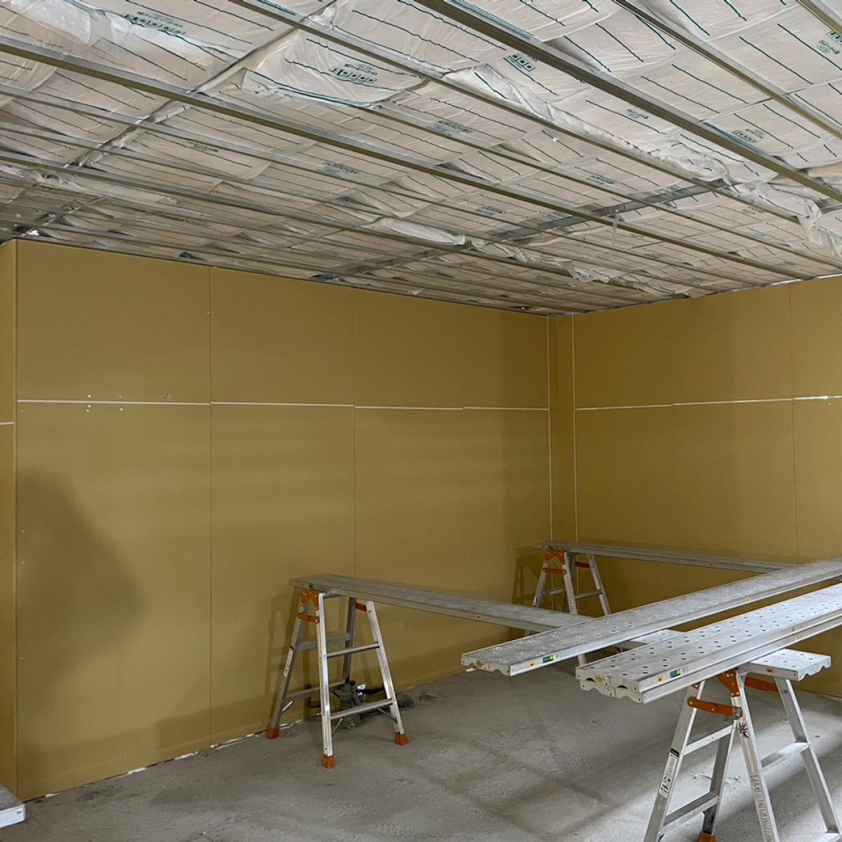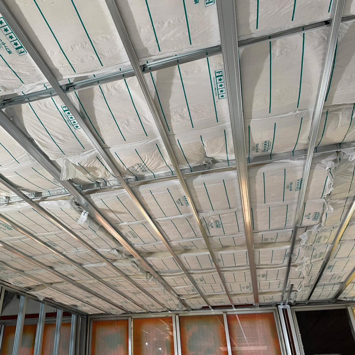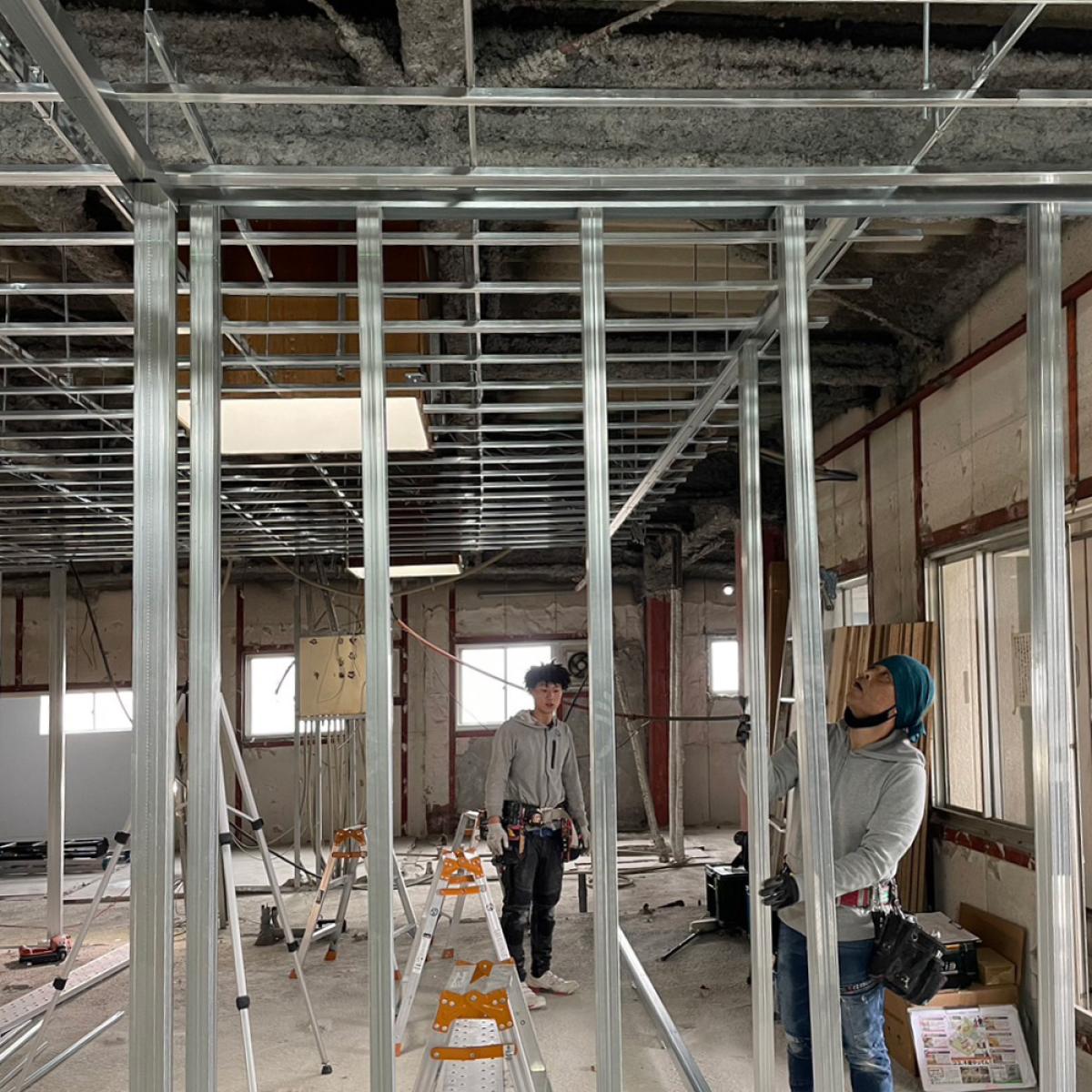 まず空間を支える骨組みを組んでいきます。骨組みには木材を使う場合と鉄骨を使う場合があり、それぞれ特徴が異なります。木材は加工がしやすく小規模な住宅や部分補修に向いていますが、湿気や乾燥による反りが出やすいという面もあります。一方で鉄骨(軽天)は歪みにくく、精度の高い下地をつくれるため、事務所や店舗など広い空間をしっかり支える改修工事に適しています。今回は鉄骨を採用し、このあと断熱材やボードを取り付けるための基盤を整えていきます。