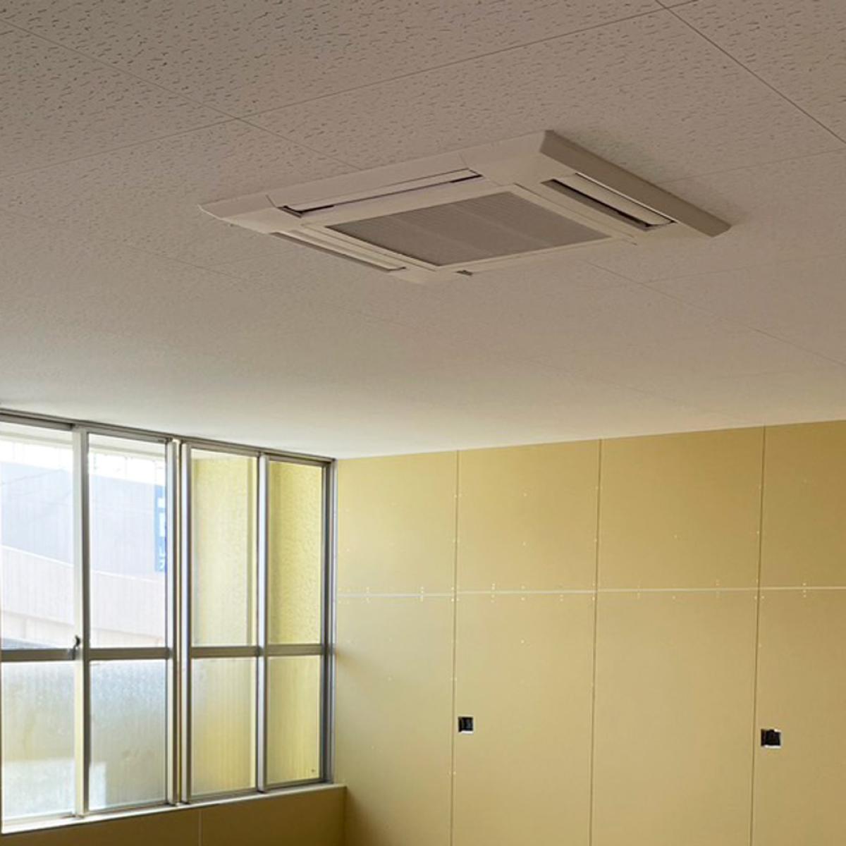 次に、天井にエアコンや照明を設置するための下地を整えます。この段階で配線や開口部をあらかじめ確保し、後の施工をスムーズに進められるよう準備します。天井埋込型エアコンは、室内の空気をムラなく循環させるため冷暖房効率が高まり、さらに壁掛け式に比べてスペースを取らないのが大きなメリットです。設置にあたっては、室内機と室外機を冷媒ガスの配管で接続する必要があり、その配管経路を天井裏に通します。軽天下地の場合も梁に相当する鉄骨材が組まれているため、配管が干渉しないよう室外機の位置を考えながら設置します。