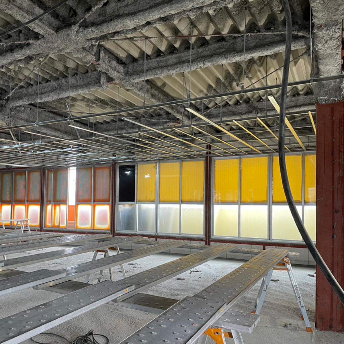 組み上げた軽天をさらに細かく配置し、壁や天井のラインを整えていきます。鉄骨のフレームをしっかり組み合わせることで、最終的に壁や天井がきれいに仕上がるよう調整することができます。軽天は石膏ボードやクロスといった仕上げ材を支える「見えない土台」です。耐火性や遮音性を高める役割もあり、空間の質を底上げする大切な工程となります。