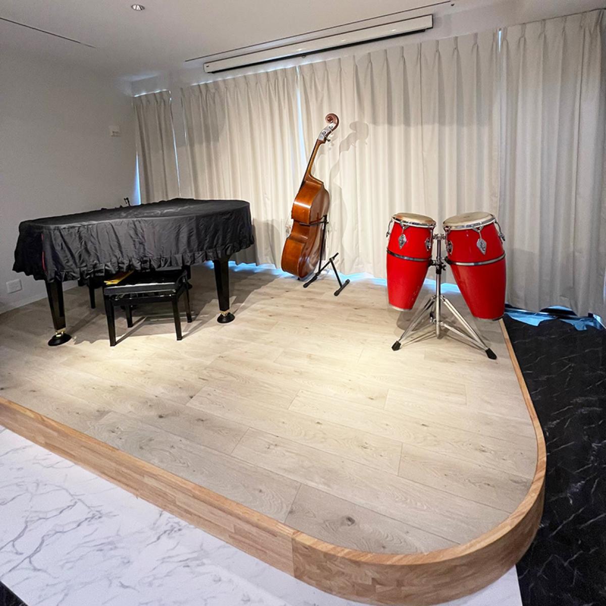 「音楽好きが自然と集まる場所にしたい」というオーナーさまの想いをもとに、設計段階から空間づくりをスタートしました。店内には生演奏や弾き語りなどのライブが楽しめるステージを設け、本格的な音響・照明設備も完備。