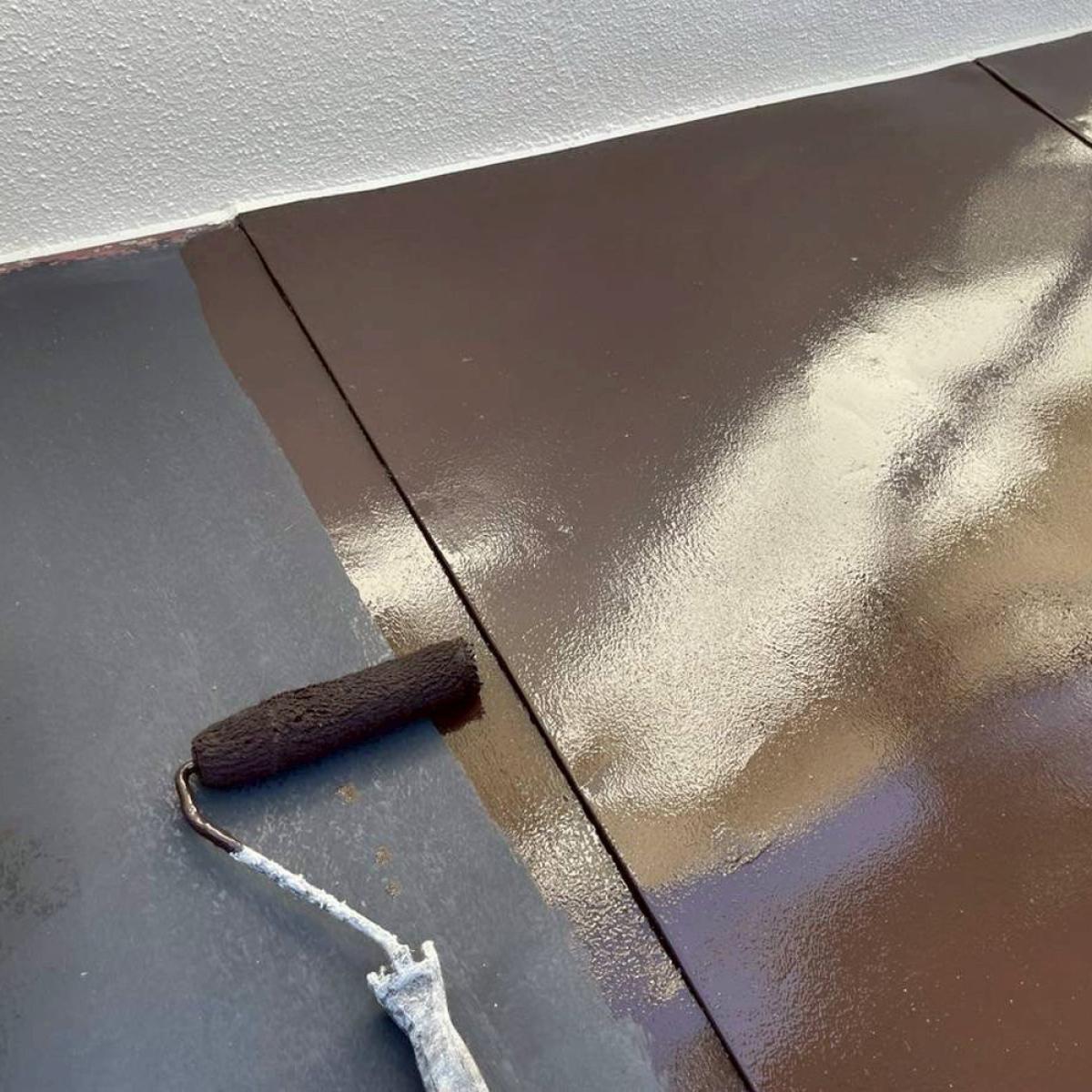最後に、仕上げとなる上塗りを行います。上塗りでは、屋根全体に均一なツヤと防水性を与え、耐候性を高めます。今回使用した塗料は、紫外線に強く、退色しにくいタイプ。雨水を弾き、汚れが付着しにくいのが特徴です。丁寧に重ねて塗り上げることで、美観と機能性の両方を兼ね備えた屋根に仕上がります。