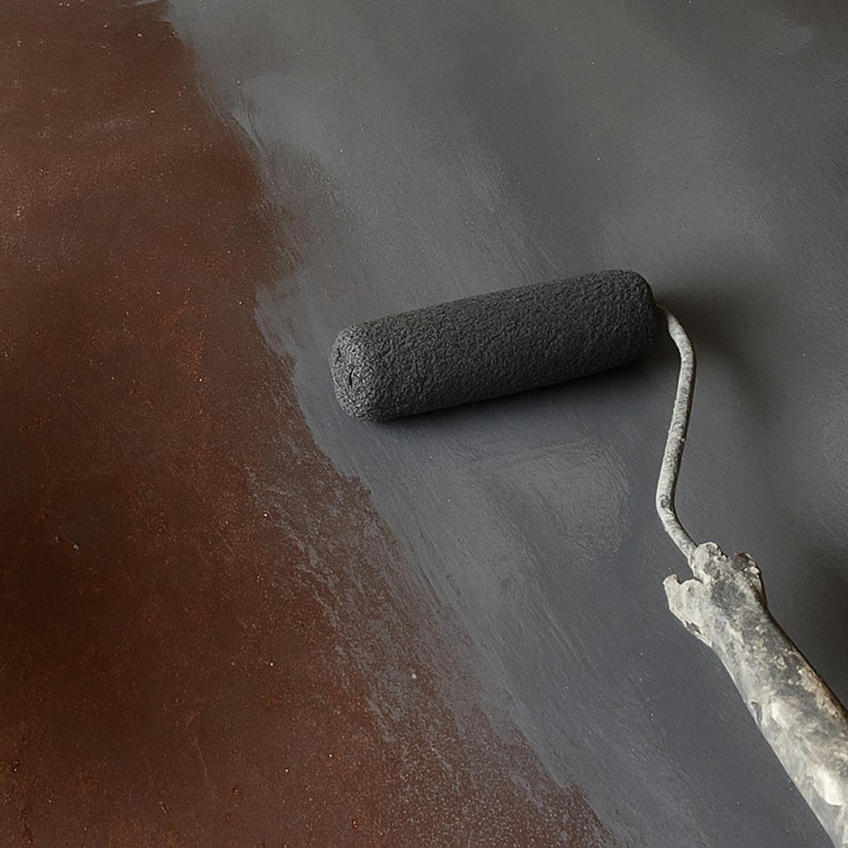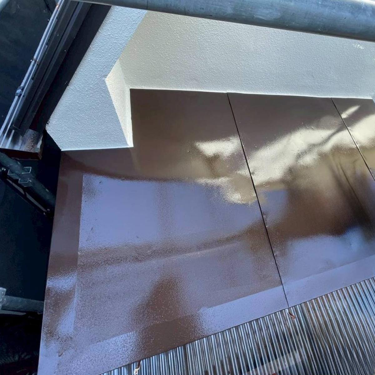 鉄部専用のエポキシ系防錆塗料を使用し、下塗りを行います。この塗料は金属との密着性が非常に高く、酸素や水分の侵入を防ぐことでサビの発生を抑えます。また、上塗り塗料の密着を助ける接着層としての役割も果たすため、屋根全体の塗膜強度を支える基盤となる工程です。下塗りがしっかりと施工されていることで、仕上がりのツヤや耐候性にも差が出ます。