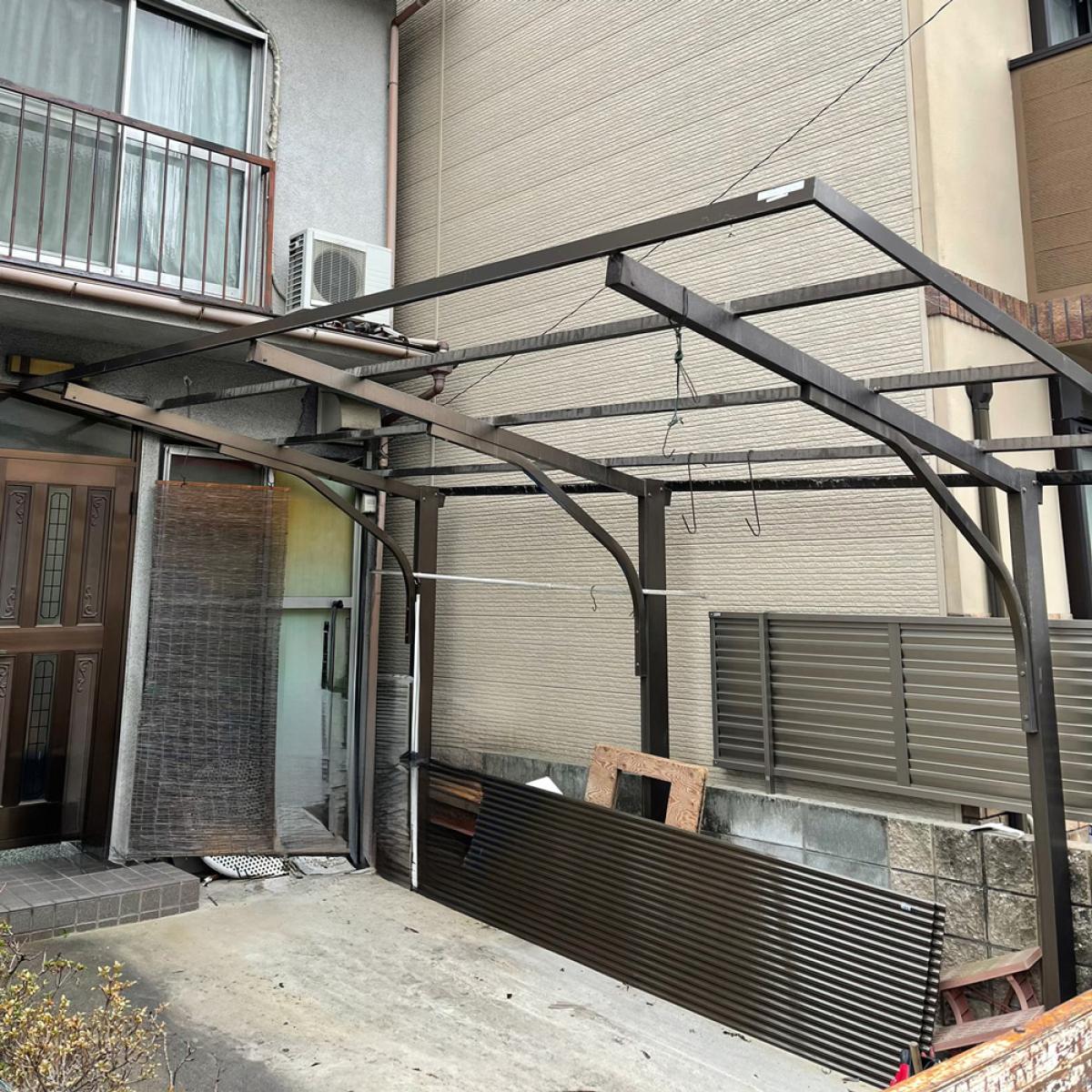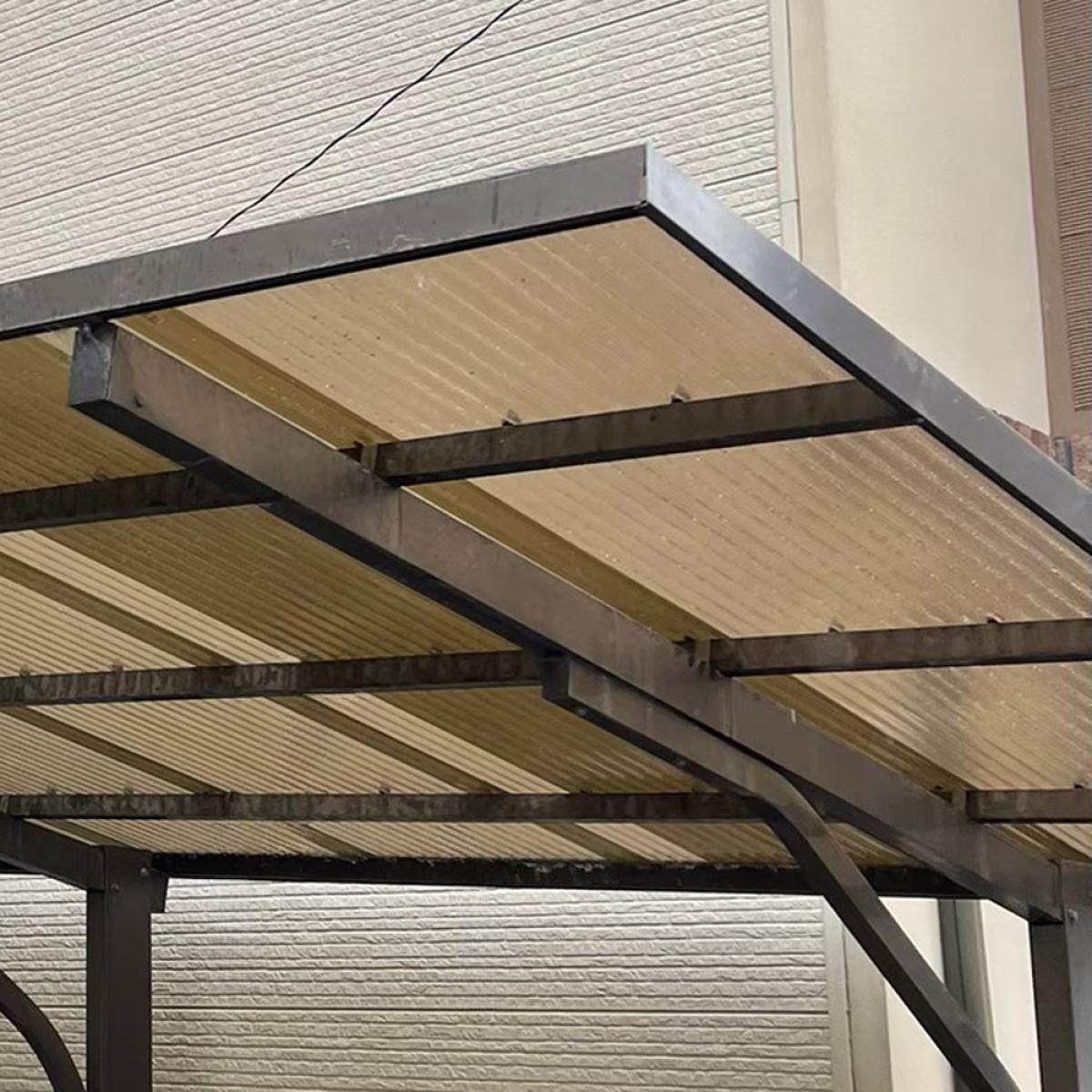 すべての波板を撤去すると、カーポートは骨組みだけの状態になりました。この段階でフレームのゆがみ、錆、留め具の状態などをしっかりチェックします。今回はフレームがしっかりしていたため、問題なく新しい屋根材へ交換可能でした。骨組みだけになると、カーポートの広さや形状がより分かりやすくなり、「どれくらい明るくなるか」「どれくらい見た目が変わるか」のイメージが湧きやすくなります。