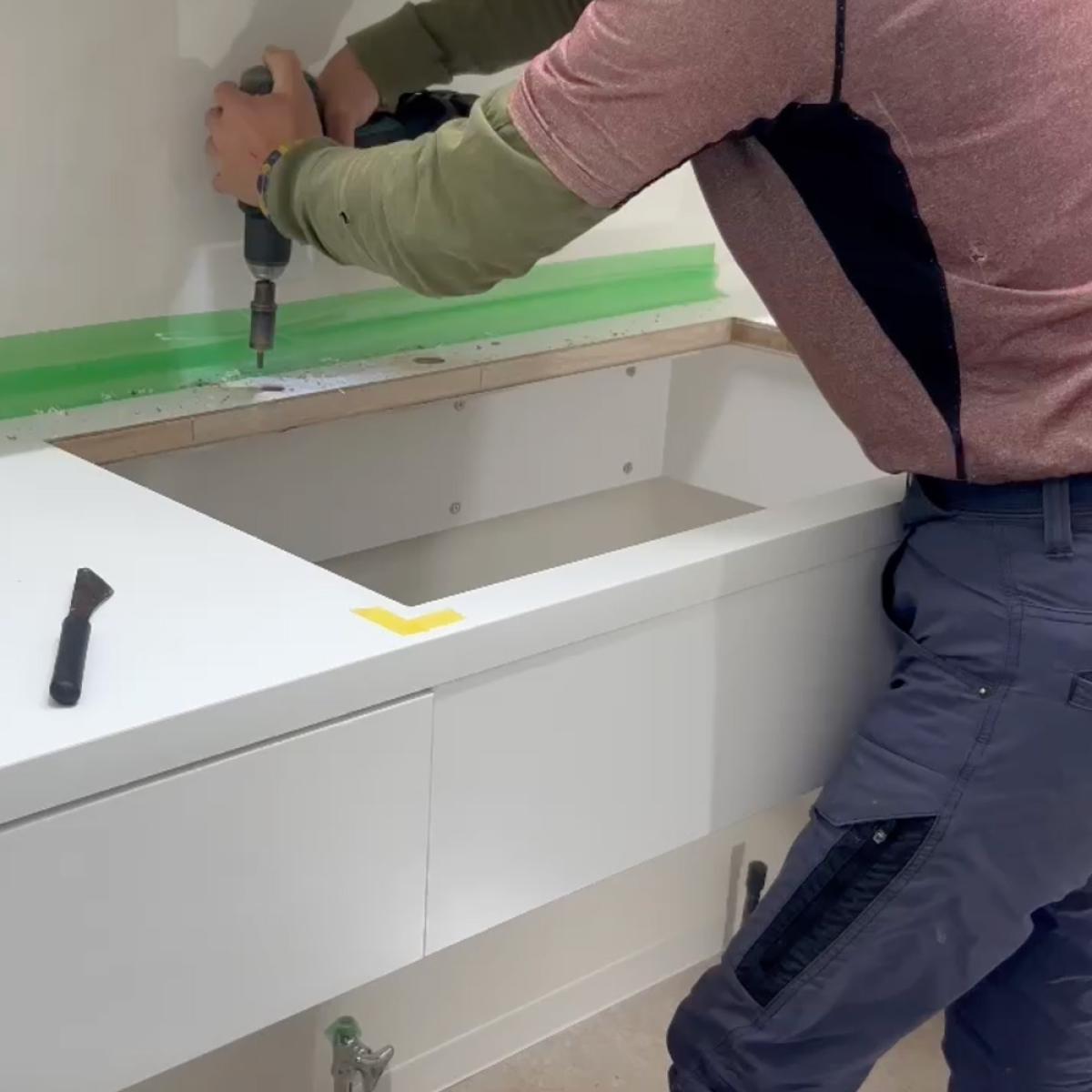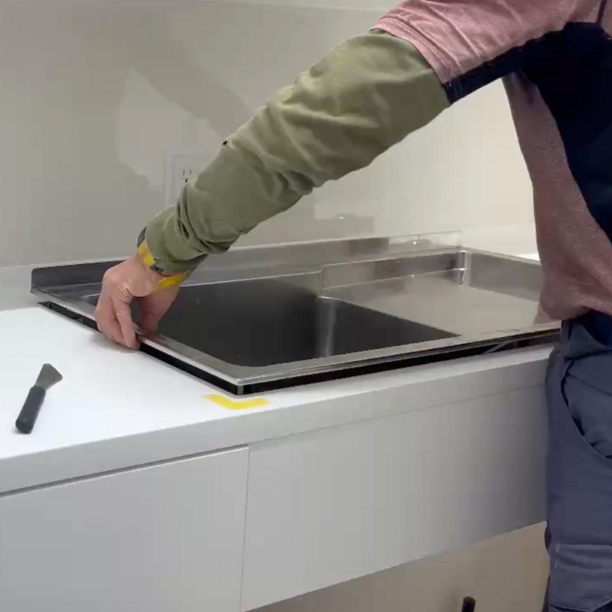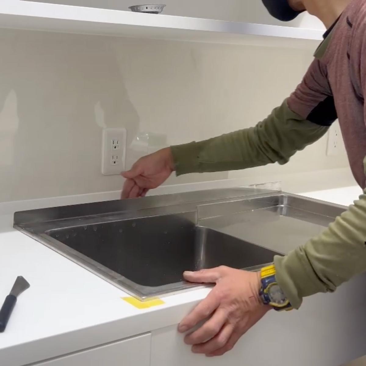 この工程は、水漏れの原因になりやすいポイントを先回りでつぶす作業です。天板との接触ラインに段差や反りがあると、隙間に水が残って黒ずみやカビ、においの原因になります。そこで、シンク縁の接地状態を確認し、必要な箇所は微調整して、止水のラインが途切れない納まりをつくります。