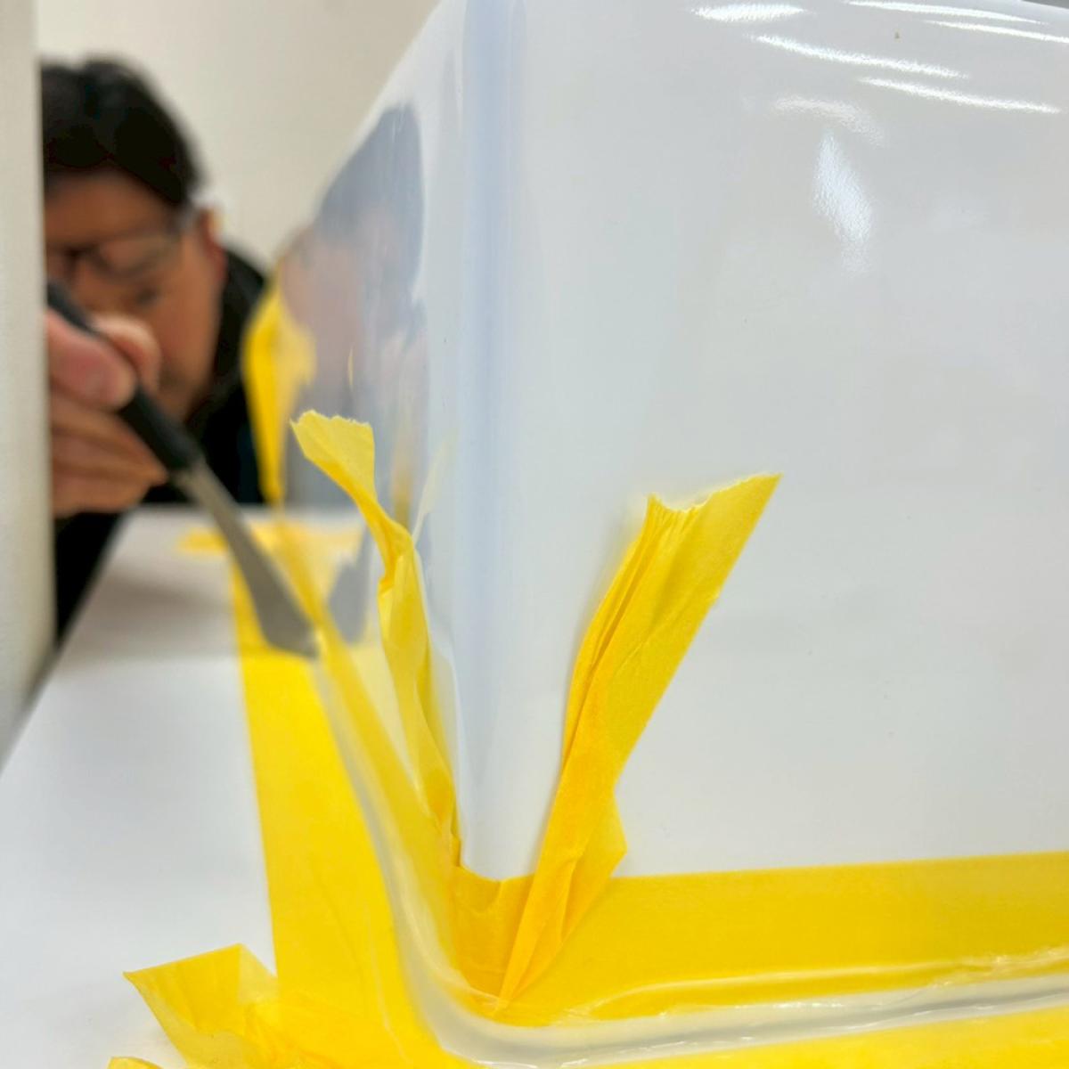 洗面まわりは日常的に水がかかるため、見た目以上にシーリングの仕上がりが重要になります。隙間が残ると水が内部に回り込み、カウンターや下地の劣化につながるためです。この工程では、先にマスキングで仕上がりラインを明確にし、余分なシーリング材が表に残らないよう調整しています。