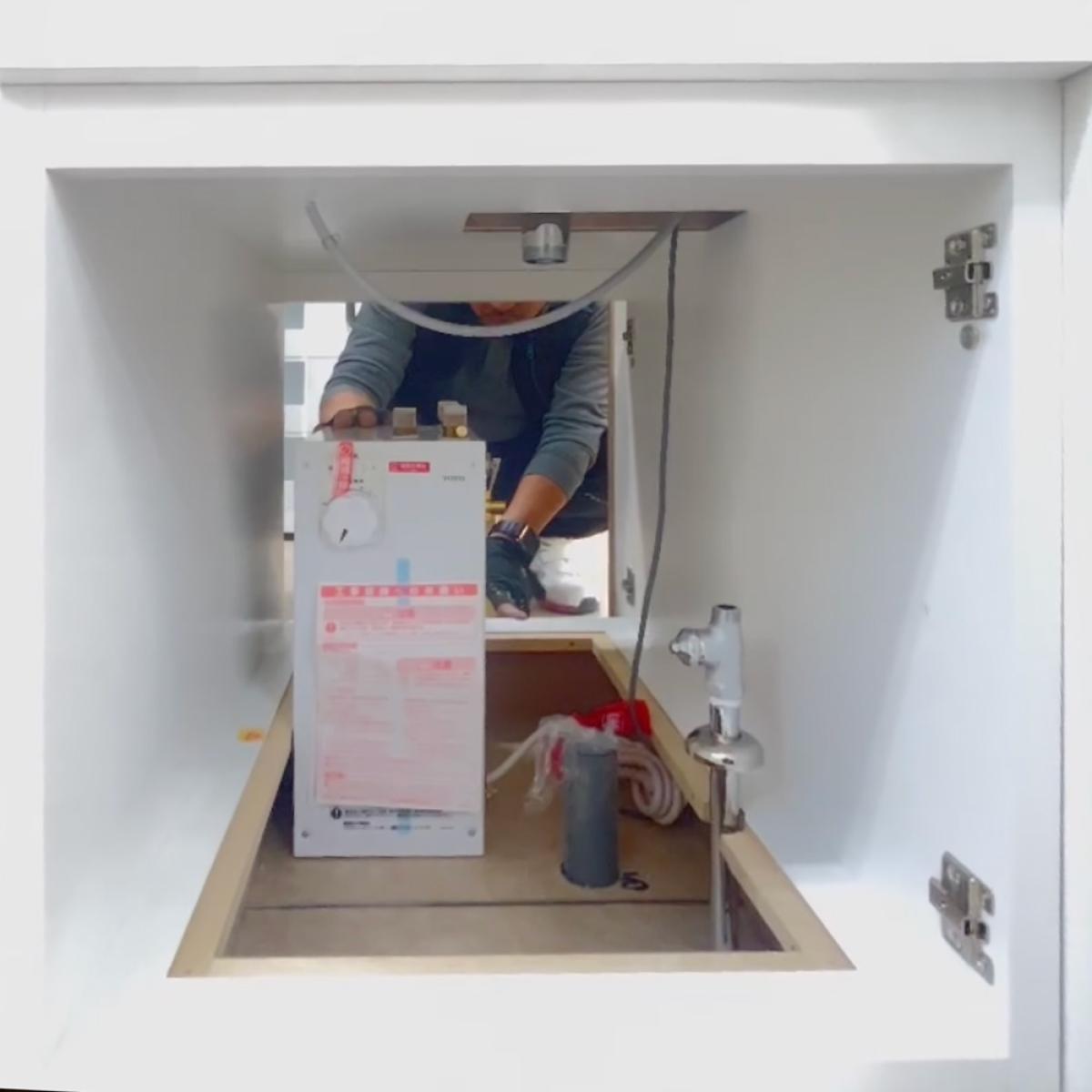 洗面台まわりのコーキング処理完了後、電気温水器をキャビネット内に設置しました。