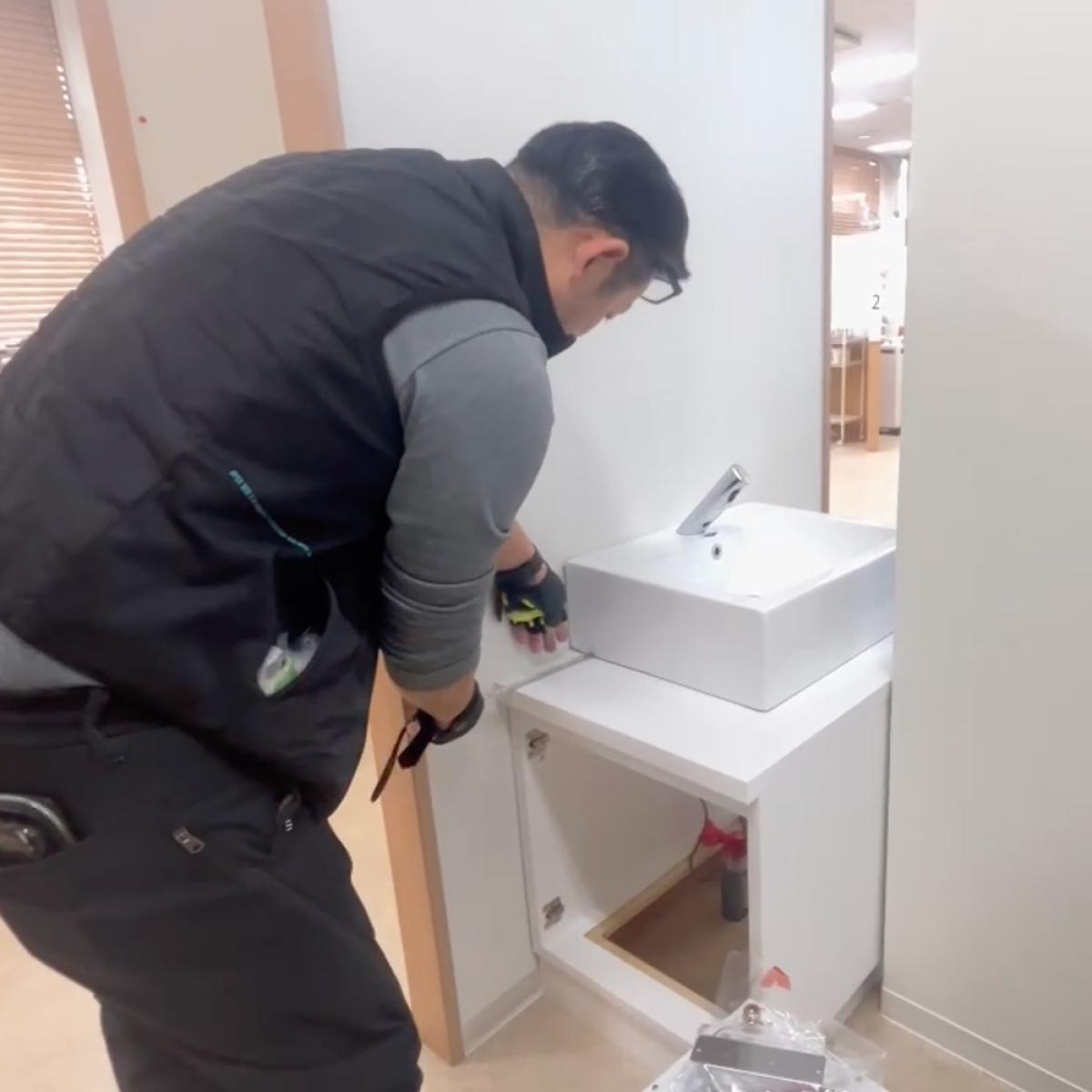 洗面台まわりの設備工事では、配管を通すだけでなく、洗面ボウル・電気温水器・収納との位置関係を現場で最終確認する工程が欠かせません。