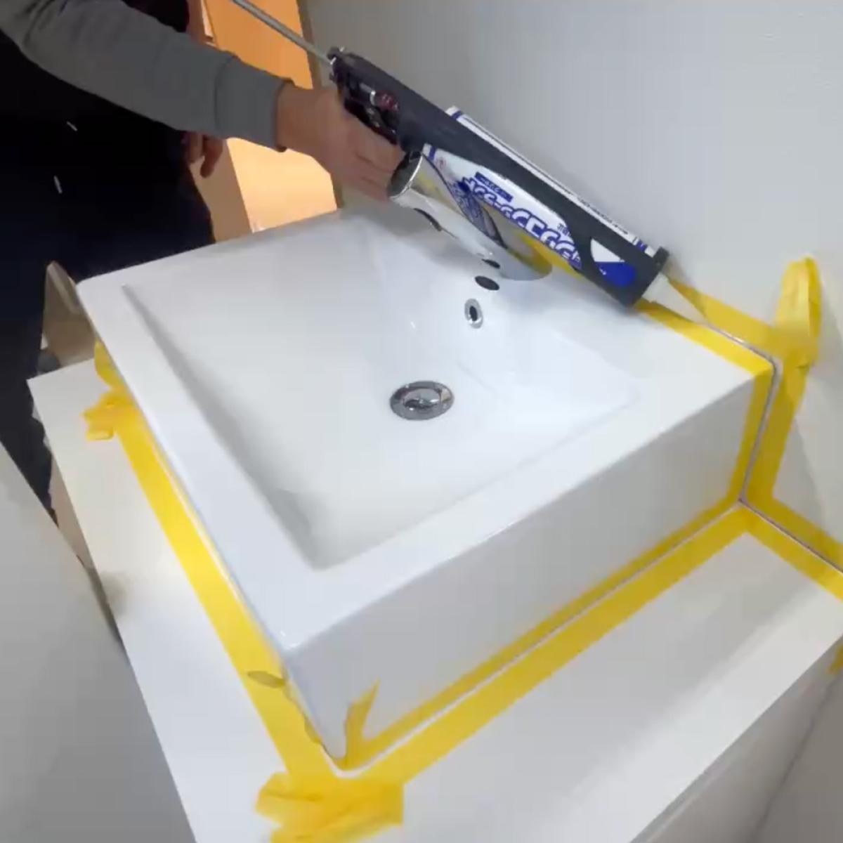 洗面ボウルの設置後、カウンターとの取り合い部分に防水処理を施している工程です。
