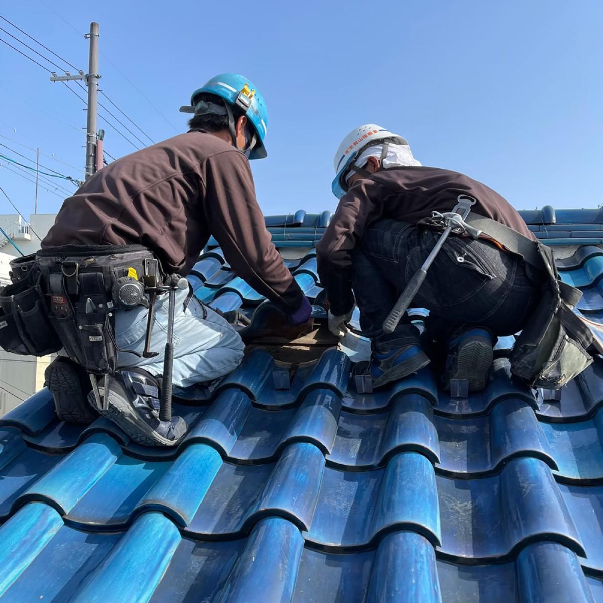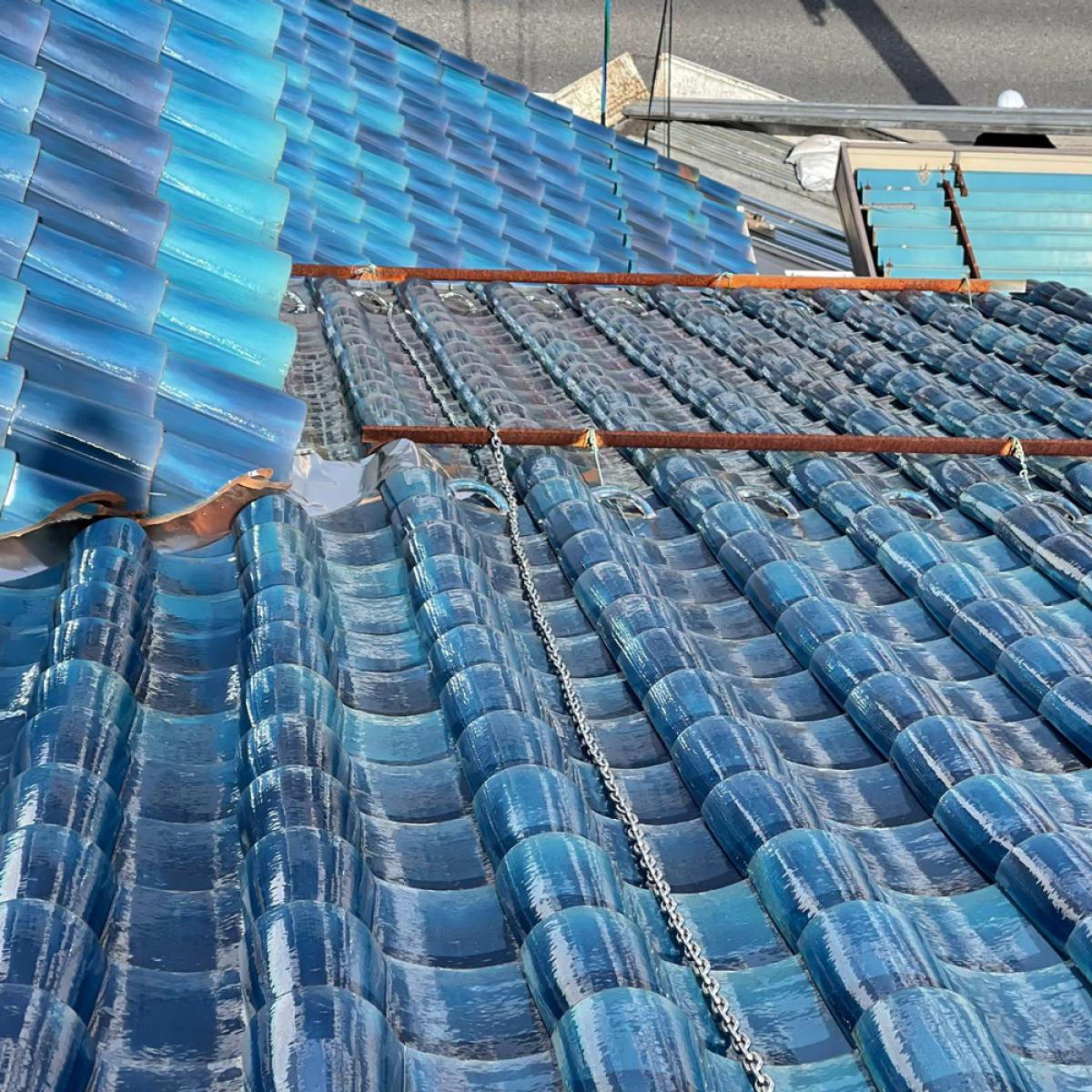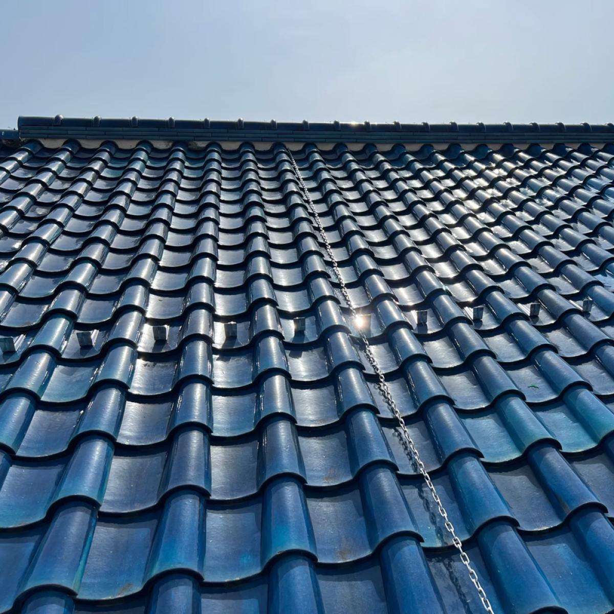 復旧では一枚ごとに指で揺らし、ガタつきがないか確認します。わずかな浮きでも風の吹き込みや雨水侵入の原因になるため、目視と手の感触の両方でチェックします。最後に屋根全体へ散水を想定した流れを確認し、水が溜まりやすい箇所がないかを判断。仕上がりの見た目だけでなく機能面まで確認して完了とします。金具設置後は瓦を元の位置に戻し、ズレや浮きがないかを確認します。この工程では見た目の仕上がりだけでなく、水の流れを阻害しないかもチェックします。屋根は雨を流す構造のため、わずかな段差でも雨水が溜まる原因になります。施工後は屋根全体を点検し、安全性と防水性を確認して作業完了です。