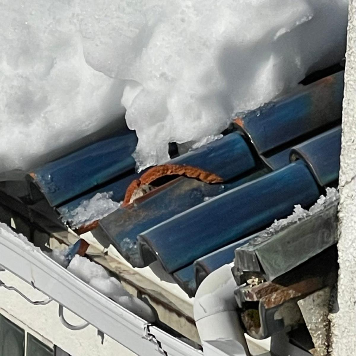 特に瓦屋根では雪が固まると大きな塊となり、車やカーポートの破損、通行人への危険、雨樋の変形などの原因になります。