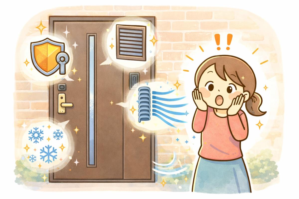 さらに最近の玄関ドアは、断熱・通風・防犯といった機能が一つにまとまっているものが多く、