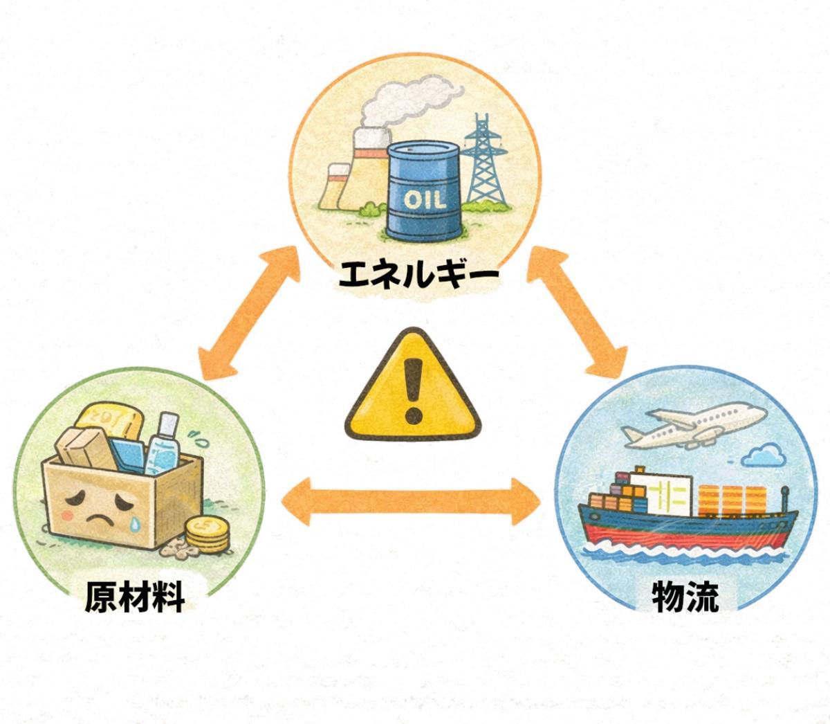 中東で緊張が高まることで、石油を運ぶ船が近づきにくくなり、結果として運ぶ量が減ったり遅れたりします。すると、その石油を原料にしている材料にも影響が出てきます。石油がなくなったわけではありません。ただ「運びにくい」という状況が続くことで、材料が不足しやすくなっています。