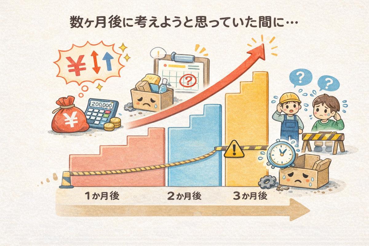 数ヶ月後に考えようと思っていた間に、価格が変わる、材料が入らない、工事のタイミングが合わない、といったことが重なる可能性があります。